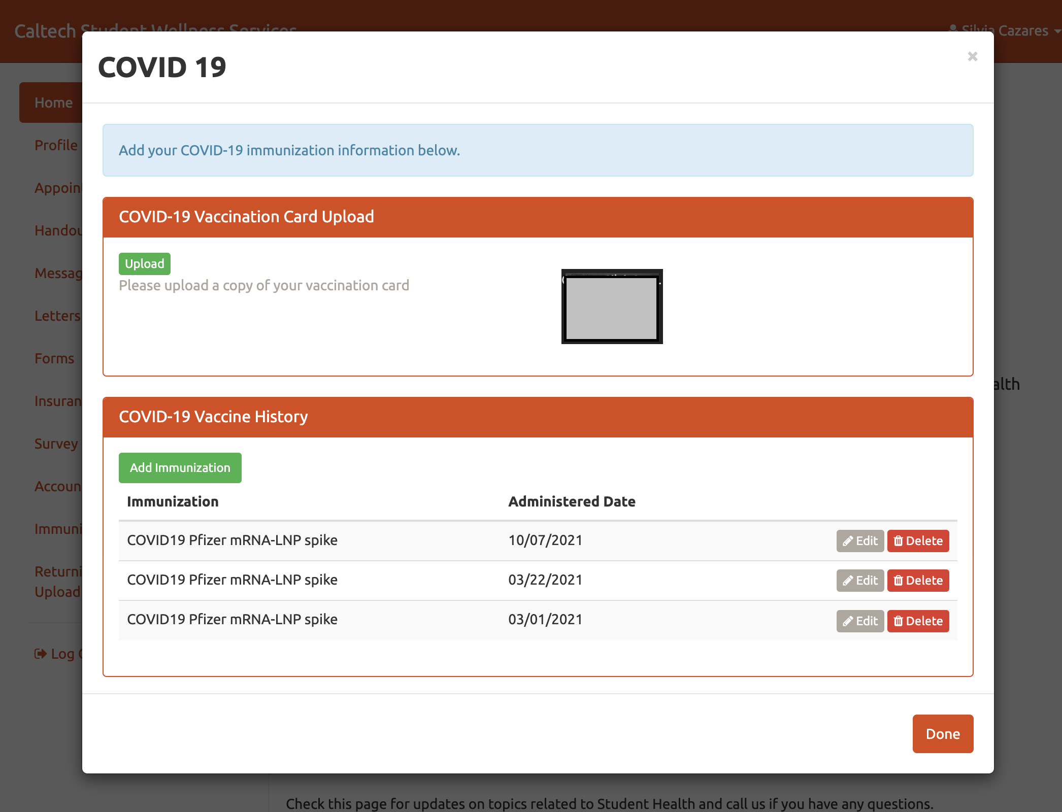 - Click Done. Once you click Done, you will no longer be able to edit or remove the submitted image(s). You may, however, upload additional images or update the vaccination history section. NOTE: There will be no indication that your files have been received.