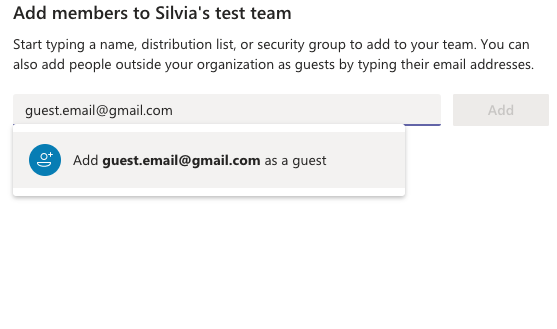 - Add the full email address of the guest (external) user you want to add, click Add [email address]