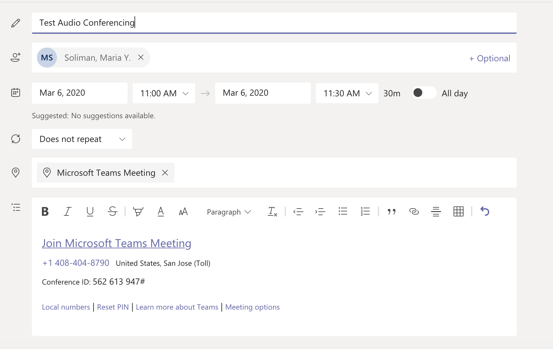 - You can also see these details by going back to the Teams calendar or Outlook and seeing the meeting details (this is only available after the meeting has been saved and sent)