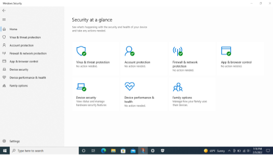 Instructions on how to open this window are provided below. It is important that Security at a glance displays "no action needed" on each selection box. If you see any yellow or red warnings, you must take action to secure your computer