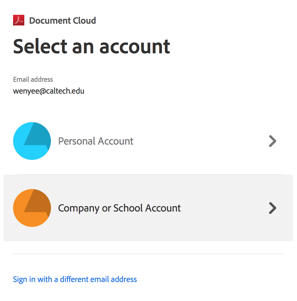 - If you already have an existing Adobe ID, be sure to choose the option to login with a Company or School Account before you get prompted to enter your Caltech access.caltech username and password. You will not be able to use the Acrobat DC license unless you are logged in with your Caltech credentials.