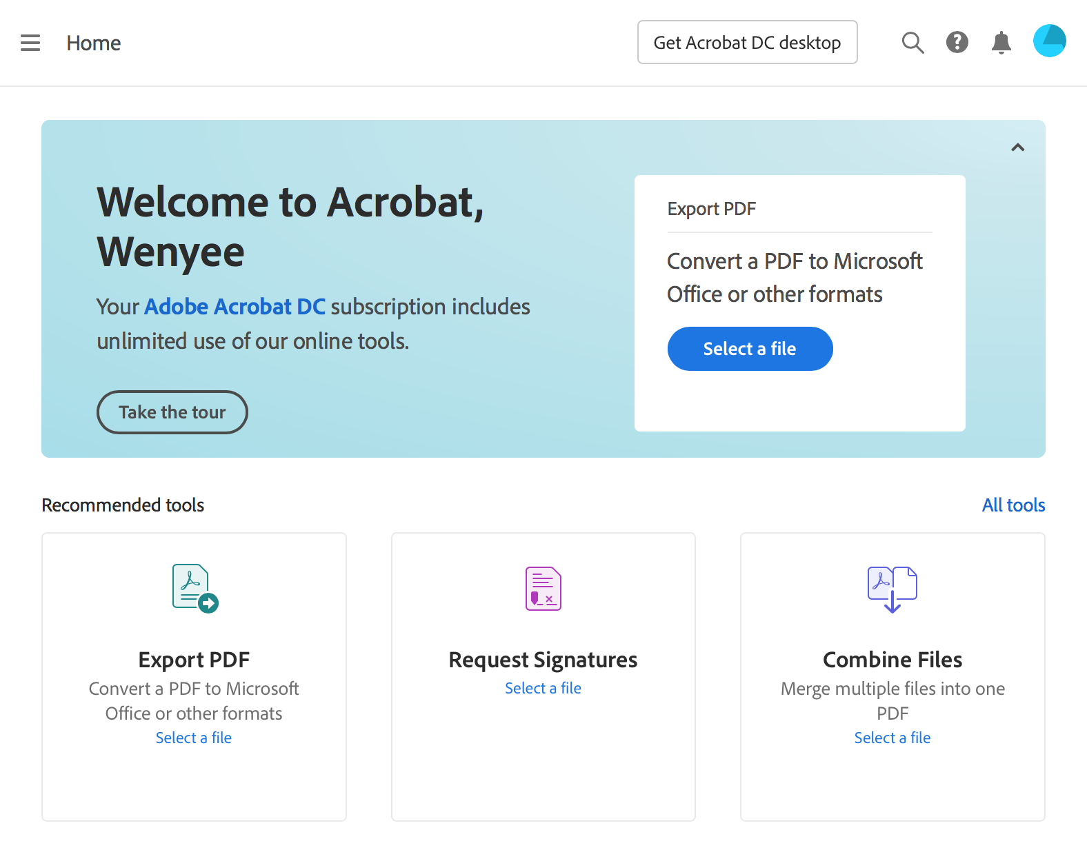 6. Note that from there, you have the option to install the Acrobat DC desktop client onto your computer or mobile device. Just click on Get Acrobat DC desktop at the top right of the page and the installer will start.