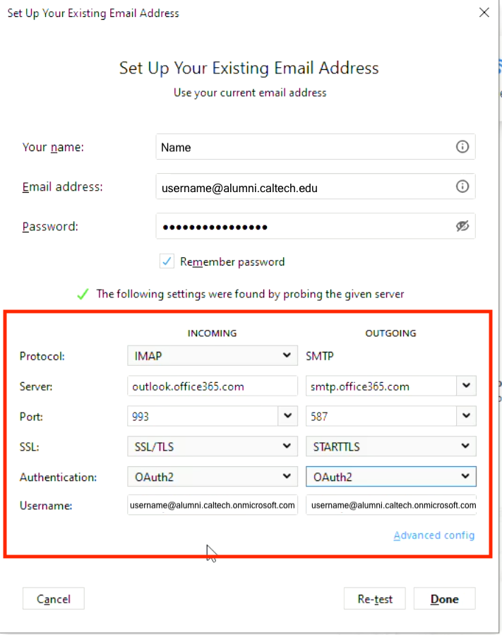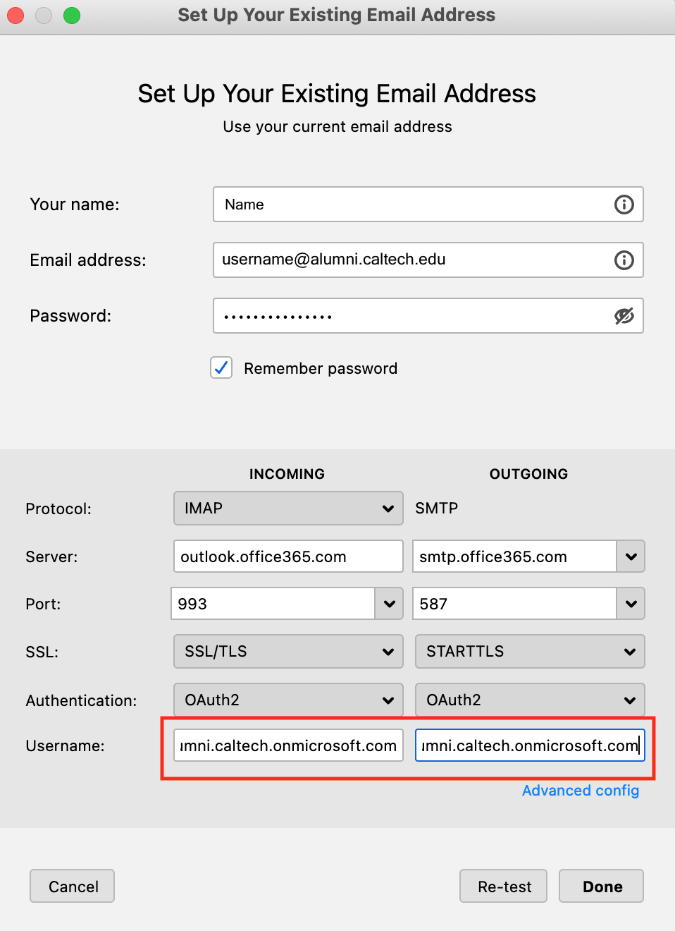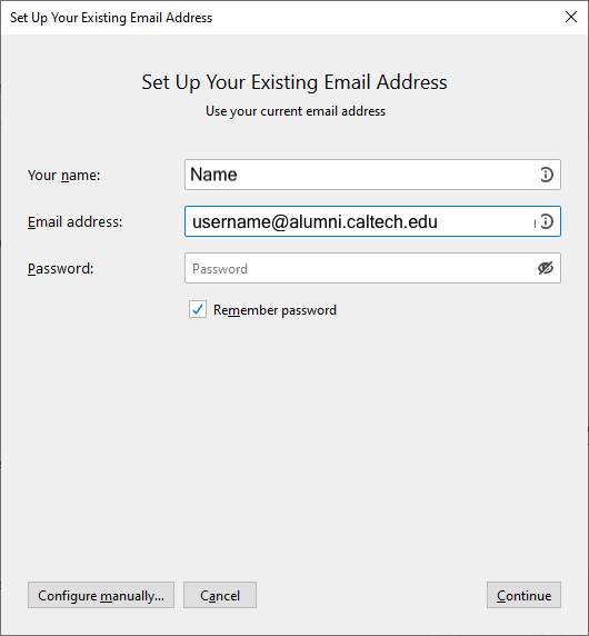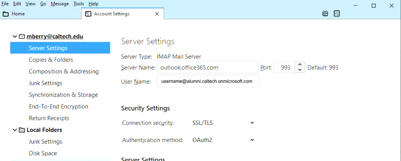 These steps will guide you through configuring Thunderbird 78 (or later) for your Caltech alumni email for the first time. If you have just updated Thunderbird and need to re-configure an existing account to use Modern Authentication, skip to Reconfigure Thunderbird for Modern Authentication.
