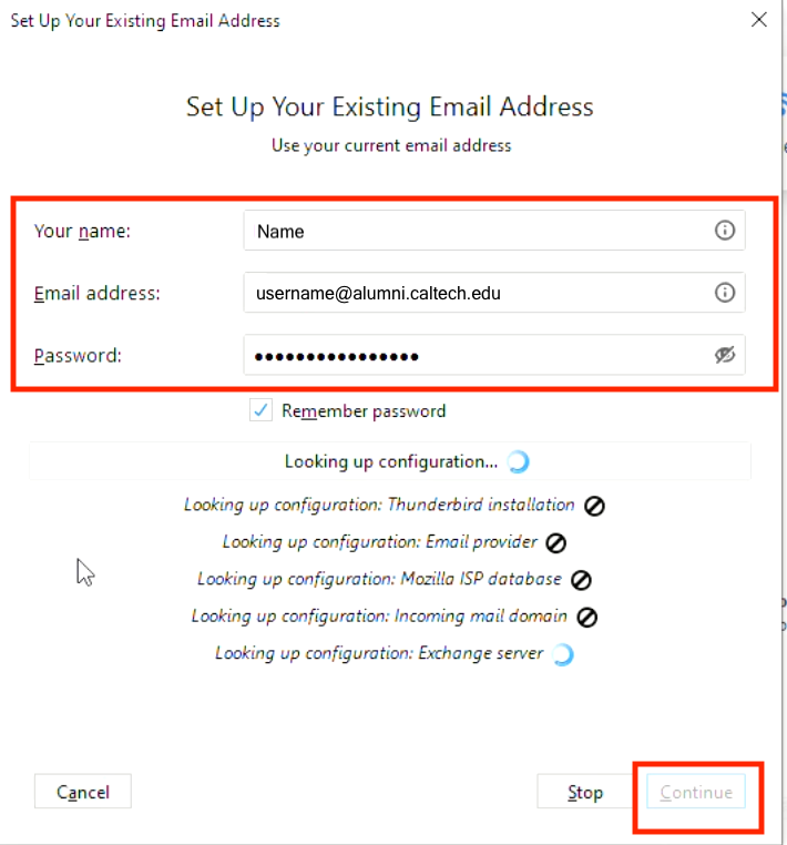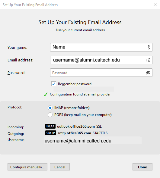 These steps will guide you through configuring Thunderbird 78 (or later) for your Caltech alumni email for the first time.