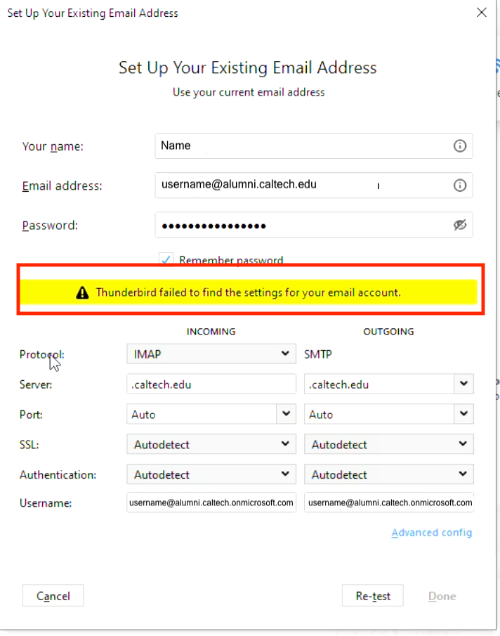 4. Thunderbird will try to auto-detect your email settings. However, most of the time auto configuration will fail giving you an error message.
