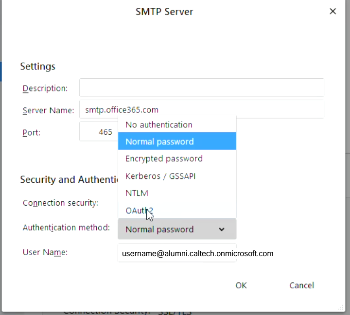 5. Update the SMTP server settings as indicated below. Note that initially you will not see OAuth2 as an authentication method, this will show up after this step.
