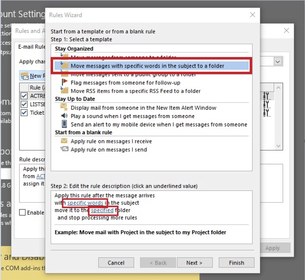 4. In the new popup window, select "Move messages with specific words in the subject to a folder". Click Next