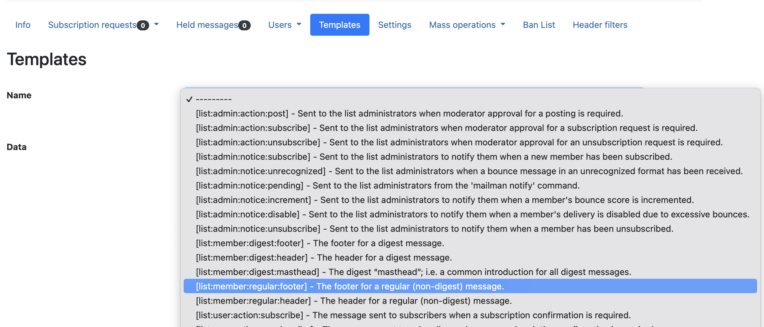 Mailman now has default footer and header message templates available under the "Templates" section available to list owners and administrators.