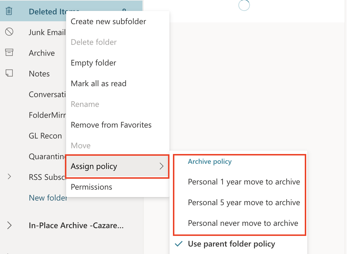 - Navigate to the folder you would like to set an archive policy for (you can start with Deleted Items, Sent Items, and Junk Email)