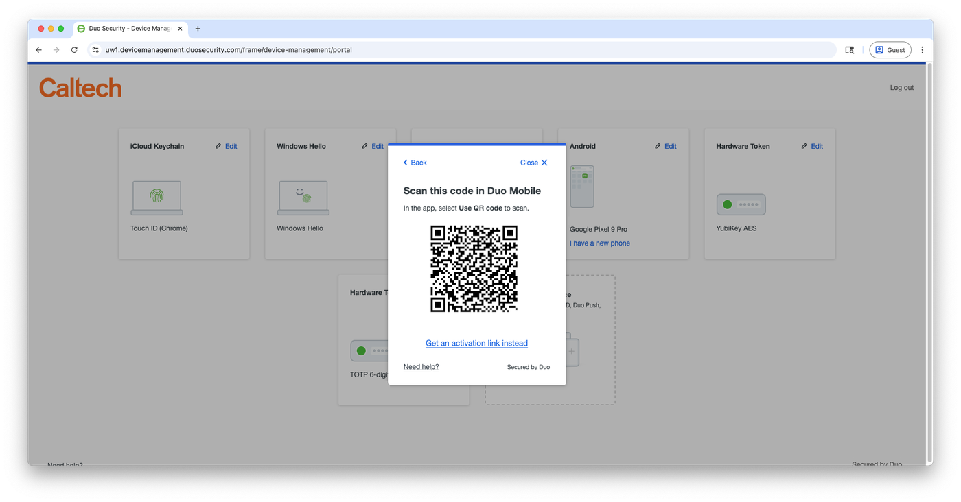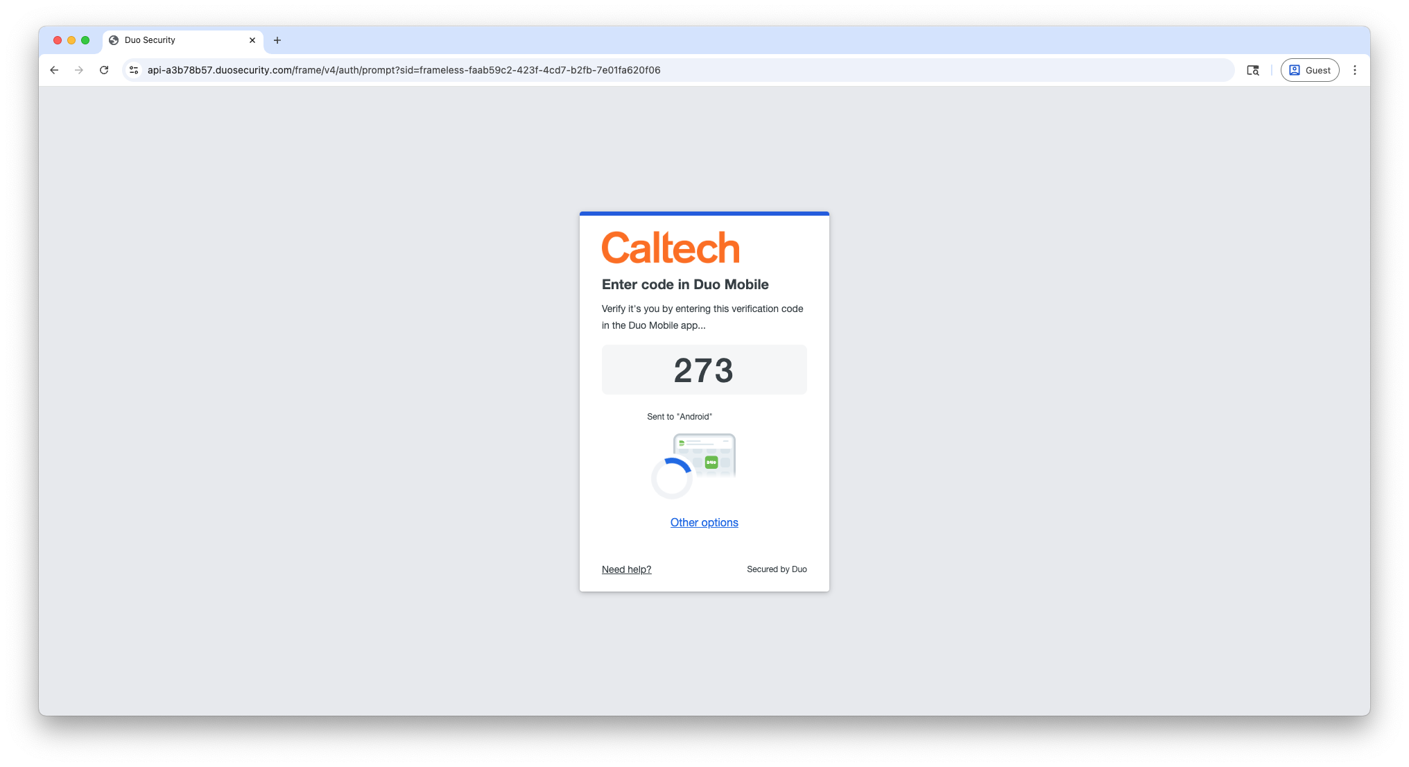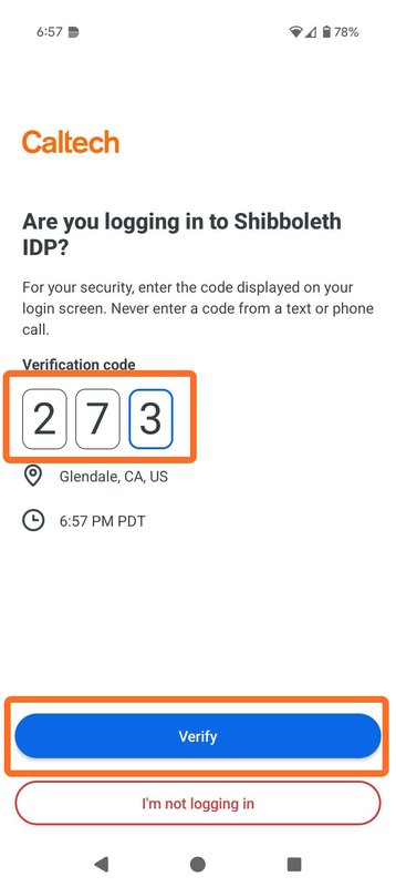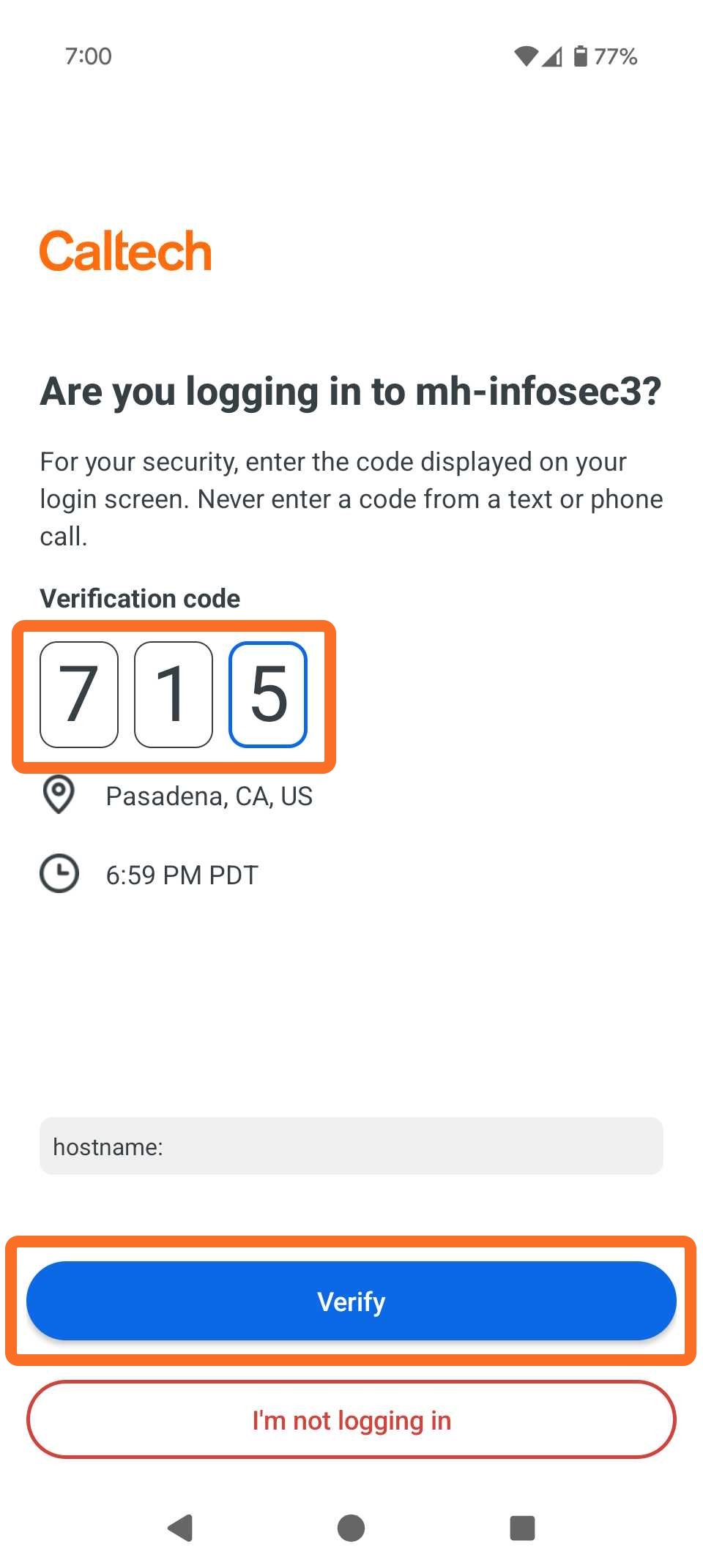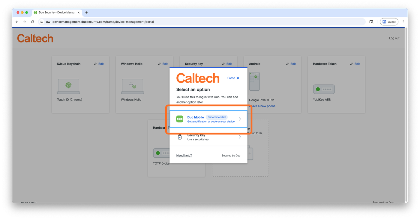 Duo Mobile Verified Push is the most commonly used authentication method with Duo at Caltech. It is a good choice for most people because it is secure, broadly compatible, and free to use with your own modern iOS or Android mobile device.