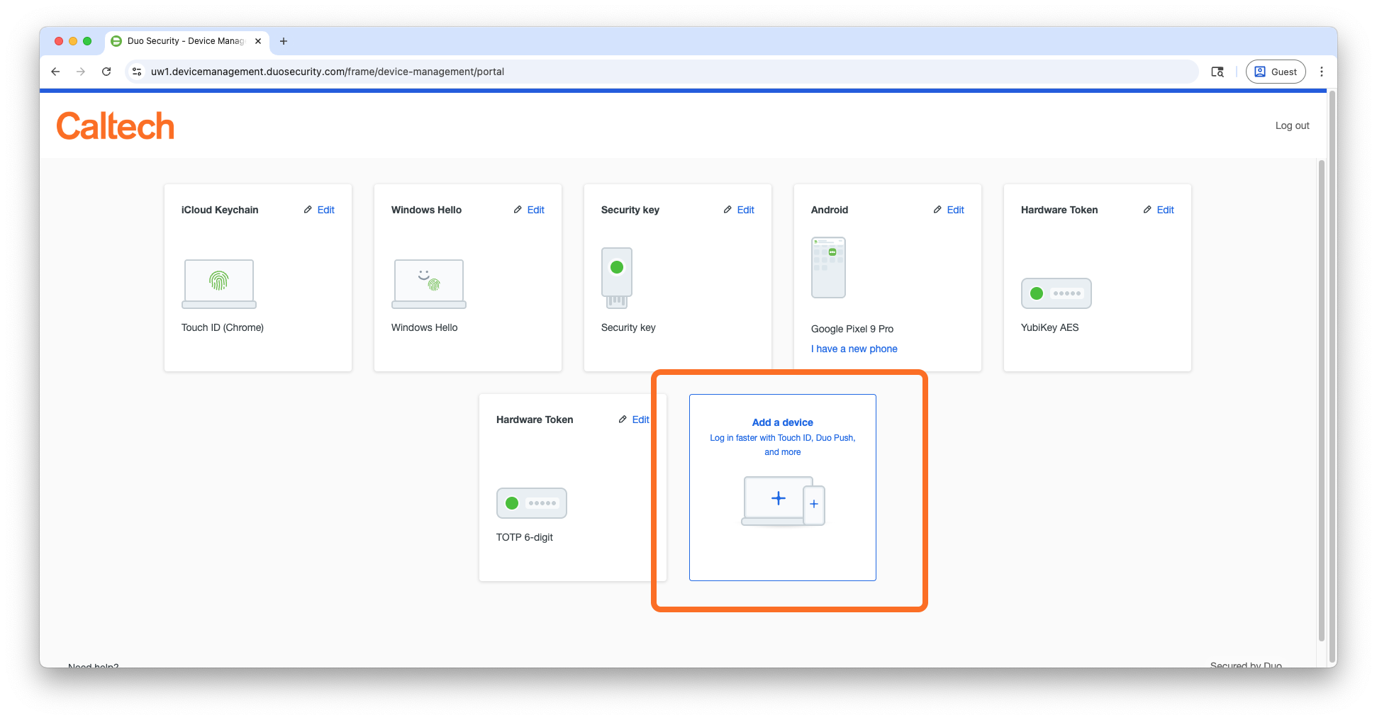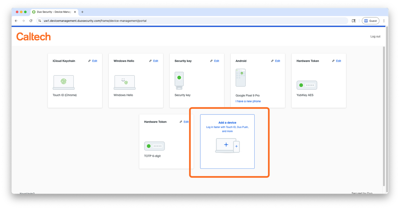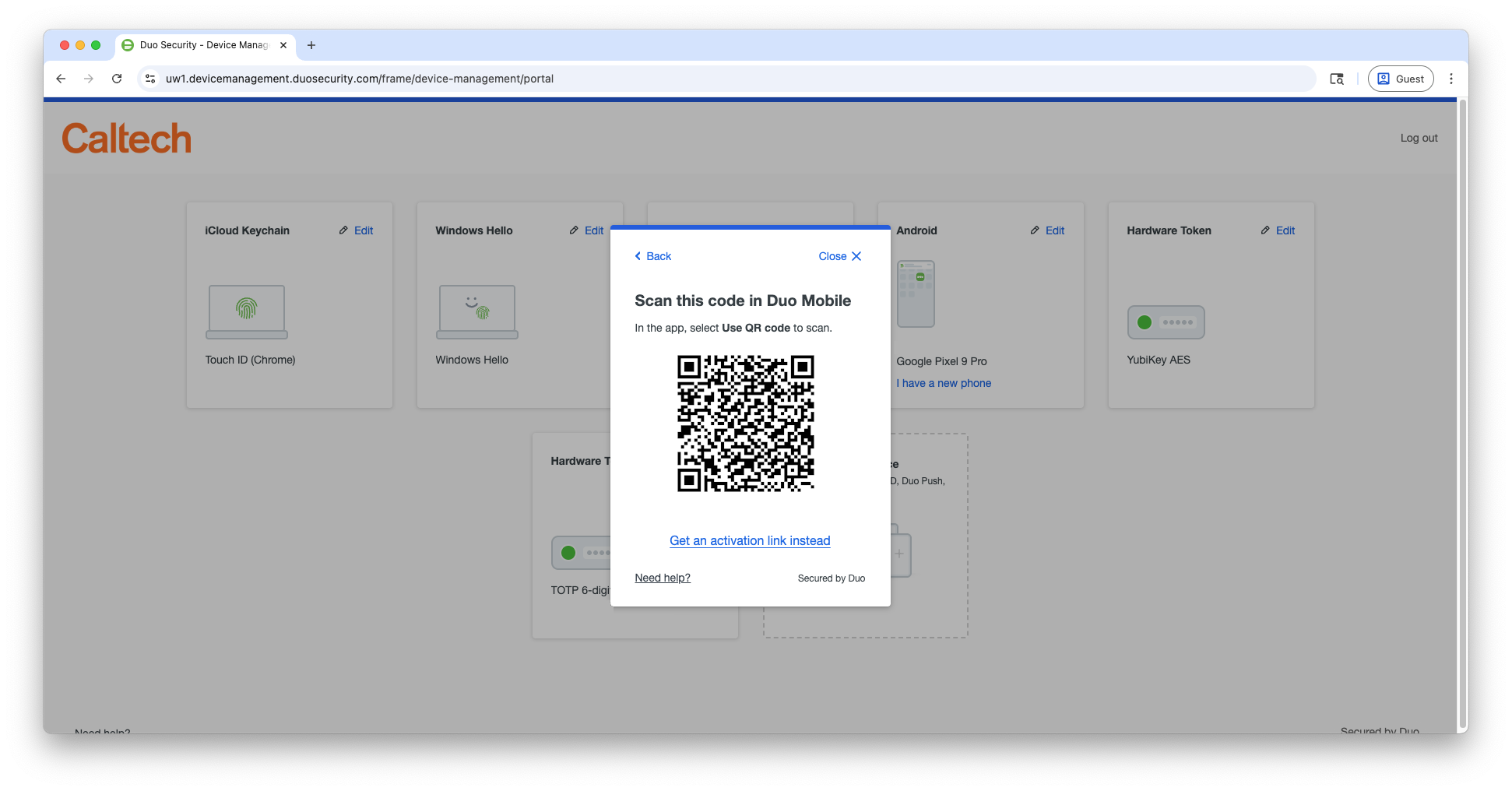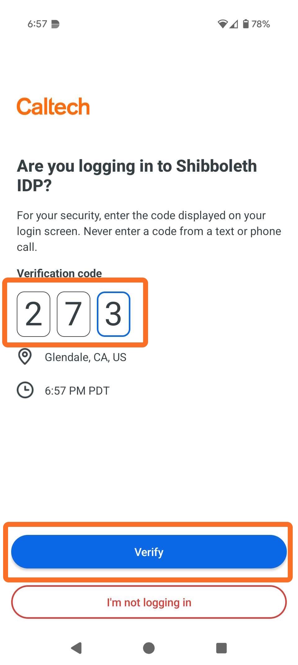 Duo Mobile Verified Push is the most commonly used authentication method with Duo at Caltech. It is a good choice for most people because it is secure, broadly compatible, and free to use with your own modern iOS or Android mobile device.