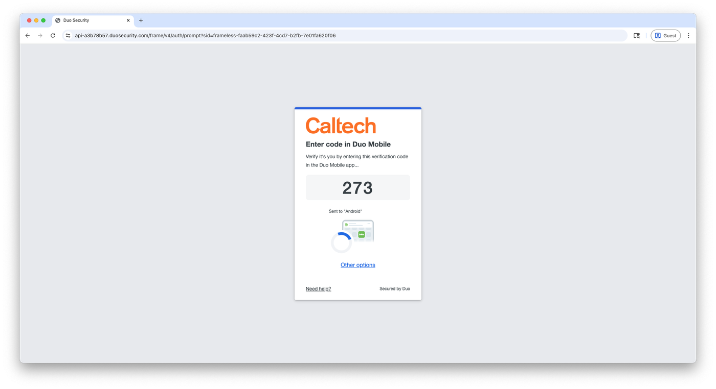 - Duo will present you with a 3-digit code. If you do not see the code, Duo may have defaulted to a different authentication method. Click "Other options" and then "Duo Push" to manually select this option. If you do not see "Duo Push" in the list of options, you have not set up this method yet. Refer to the instructions above.