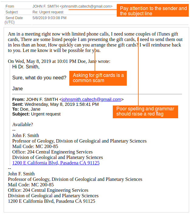 Scams messages can come from a fake sender address or from a stolen account, so an @caltech.edu sender address does not mean the message is safe. In this particular scam, it is common for criminals to create an email using a free provider such as gmail, and craft it to look like a Caltech user (e.g. [email protected]). The subject lines are often crafted to convey a sense of urgency, and the message usually includes some excuse to avoid talking in person or over the phone, such as "I'm in a meeting right now" with the goal of getting you to fall for the scam before you have a chance to think about it.