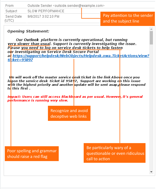 Perhaps the most blatantly obvious indicator that this is not a legitimate message is the assertion that "you need to log on service desk tickets to help fasten our investigating". The scammers are counting on users simply ignoring the message and going straight to the link. Slow down: if you don't know why you're being asked to log in, don't do it. Better yet, avoid logging in using links sent to you via email. Where possible, log in using a bookmark or navigate to the site via your web browser (for example, by going to the access.caltech web portal).