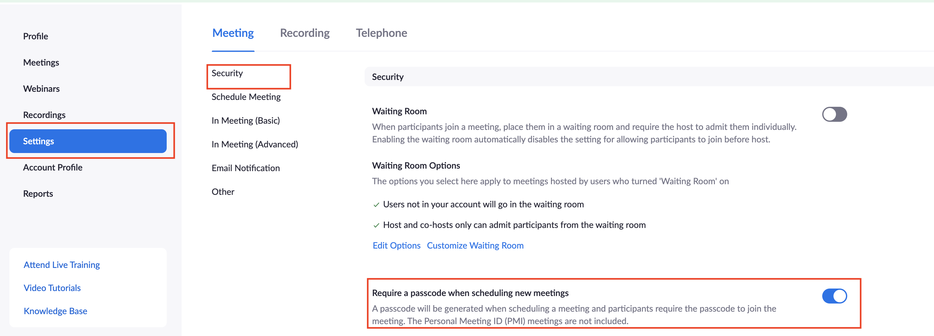 - Enable the setting for Require a passcode when scheduling new meetings