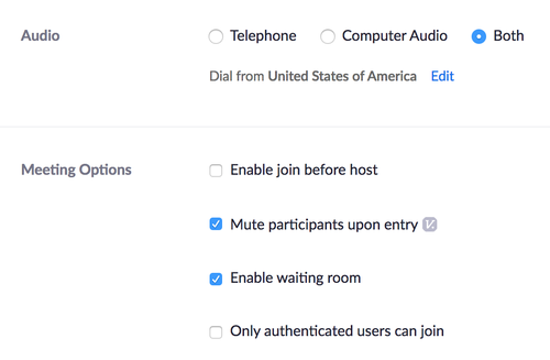 - Enable waiting room - this allows hosts to admit only students in the class. Please be aware of two issues:
