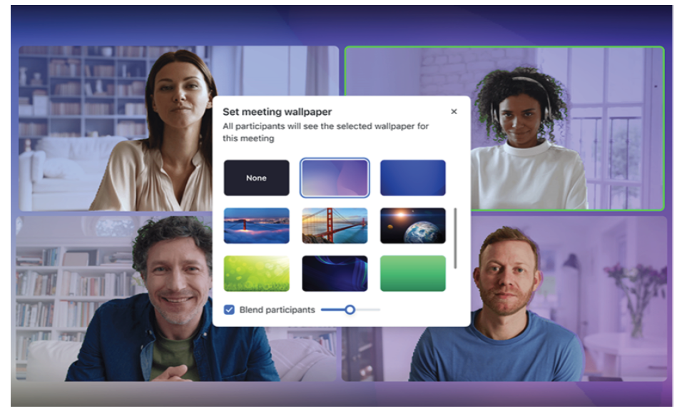 Meeting Wallpapers allow meeting hosts and co-hosts to customize their meeting view with more color and customization options. A wallpaper background provided by the admins, or a preset from Zoom, can be selected and the visuals can be adjusted to blend between participant videos and the wallpaper.