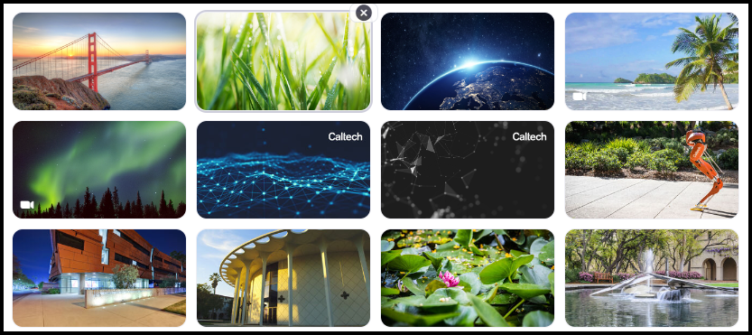 Official Caltech backgrounds can be found and used as your virtual background while on Zoom. To change your background, open Zoom and go to the top-right corner where you will see a box with either your initials or your profile picture. Go to your Settings > Backgrounds and Effects, and you will see several options to select from. You can also select your background during a meeting by clicking the arrow button next to the video icon, and select Change Virtual Background.
